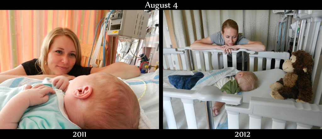 Both my second transmission and the interrogation confirmed the first transmission, that there was indeed something wrong with the pacemakers function. Evan’s heart was only responding (beating) to the pacemaker occaisonally. For the most part Evan’s heart was beating at his underlying rate of 60 beats per minute (bpm), not the normal 110 bpm that his pacemaker is set for. They changed some settings on the pacemaker and were able to get his rate up to about 80 bpm consistently. The cardiologist then explained to us that they had increased the voltage as high as they can and it was still not enough, there’s likely something wrong with one of the leads attached to the heart. Either the lead itself is broken or there is a problem with the attachment of the lead to the heart. In either case Evan will need surgery to replace the lead. We were told that Mott Children’s Hospital would have a bed ready for us by the time we got here so we went home to pack.We arrived at Mott Children’s Hospital at about 6:30pm and made our way to our new room. It was a very long night as Mr. Evan had no interest in going to sleep. He was out of his element and not happy about it. He was extremely active however. In his hospital cirb he was moving all over the place, playing with his toys and throwing everything over the side. Sometime shortly after midnight Evan finally fell asleep…for an hour, when I was awoken by the nurse coming to get some vital signs. Nevermind that I had a different nurse grab some vitals before he fell asleep. 😕 But he went back to sleep without much problem.